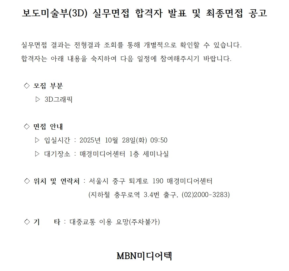 보도미술부(3D) 실무면접 합격자 발표 및 최종면접 공고