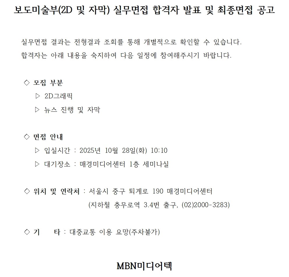 보도미술부(2D 및 자막) 실무면접 합격자 발표 및 최종면접 공고