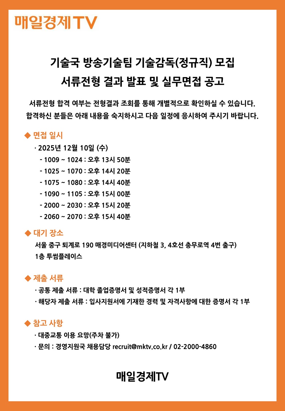 매일경제TV 방송기술팀 기술감독 모집 서류전형 합격자 및 실무면접 공고