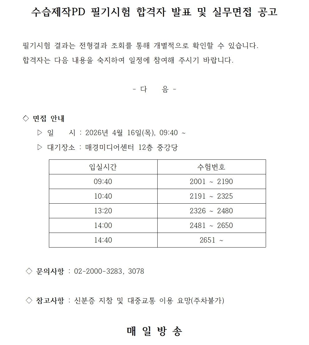 수습제작PD 필기시험 합격자 발표 및 실무면접 공고