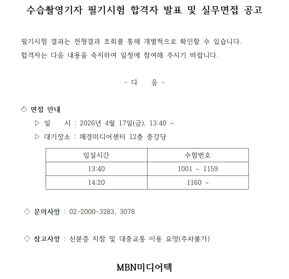 수습촬영기자 필기시험 합격자 발표 및 실무면접 공고