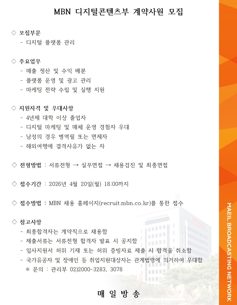 MBN 디지털콘텐츠부 계약사원 모집