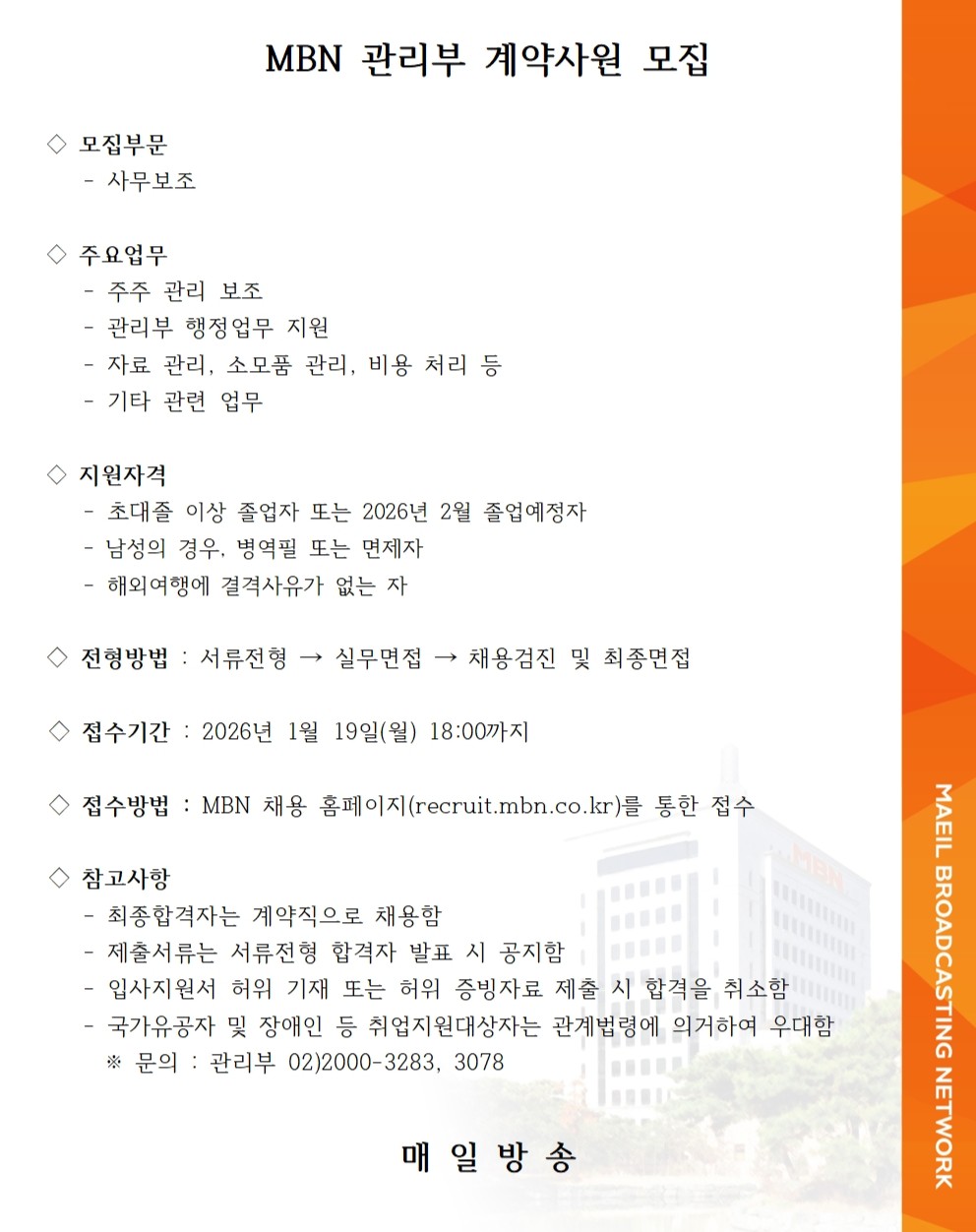 MBN 관리부 계약사원 모집
